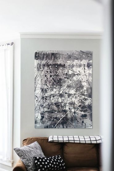 This acrylic painting captures a storm of emotion, blending layers of pain, hope, and despair. The chaotic splatters and drips of black and white paint seem to dance across the canvas like tangled threads of fate, representing the inner turmoil of losing faith in finding love. The contrasting tones evoke the starkness of heartbreak—a light shade symbolizing fleeting moments of hope, overwhelmed by darker, bolder strokes that speak to the deep wounds left behind.