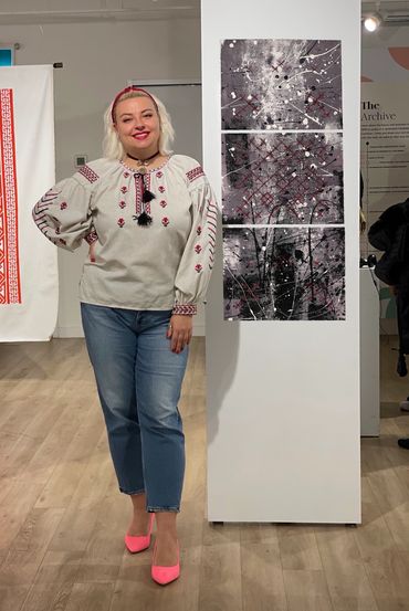 The central theme of this work is the Ukrainian soul, symbolized through the use of Vyshyvanka over canvases. Each of my three canvases represents the past, present, and future. Through these, I explore the continuity of my heritage and the resilience of my people, even in the face of destruction.